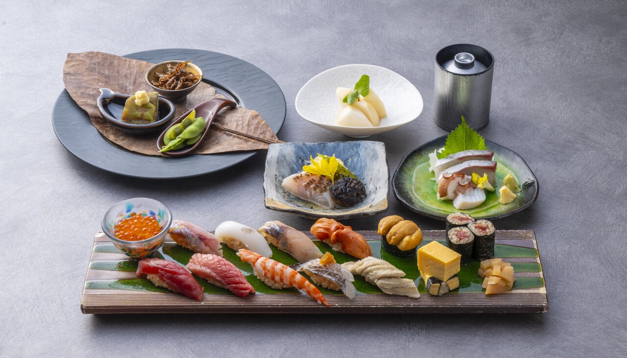 The set includes seven dishes, including appetizer, sashimi, eight carefully selected nigiri sushi pieces, and dessert.