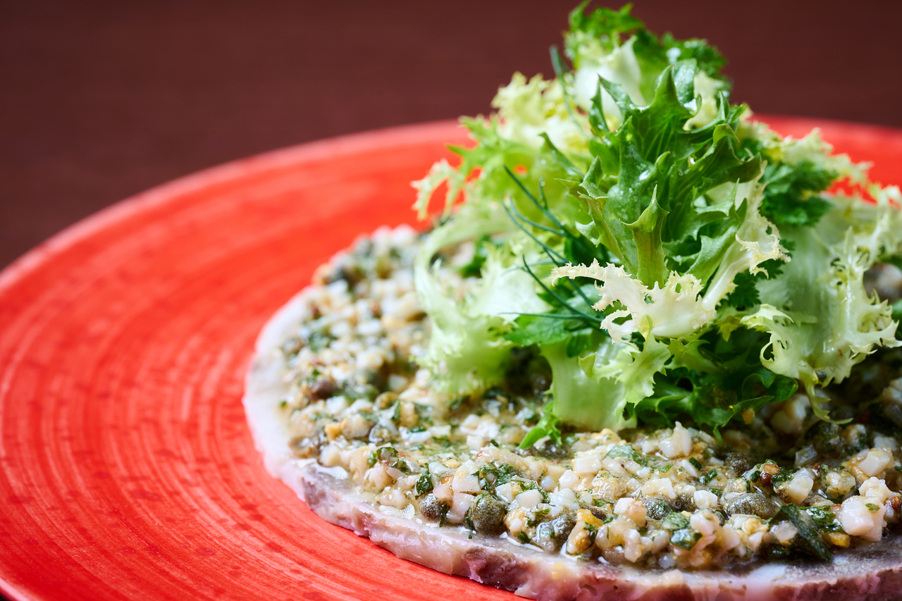 北海道産星空の黒牛もも肉のロティ ソースペリグー 栗とセロリの小さなタルト添え