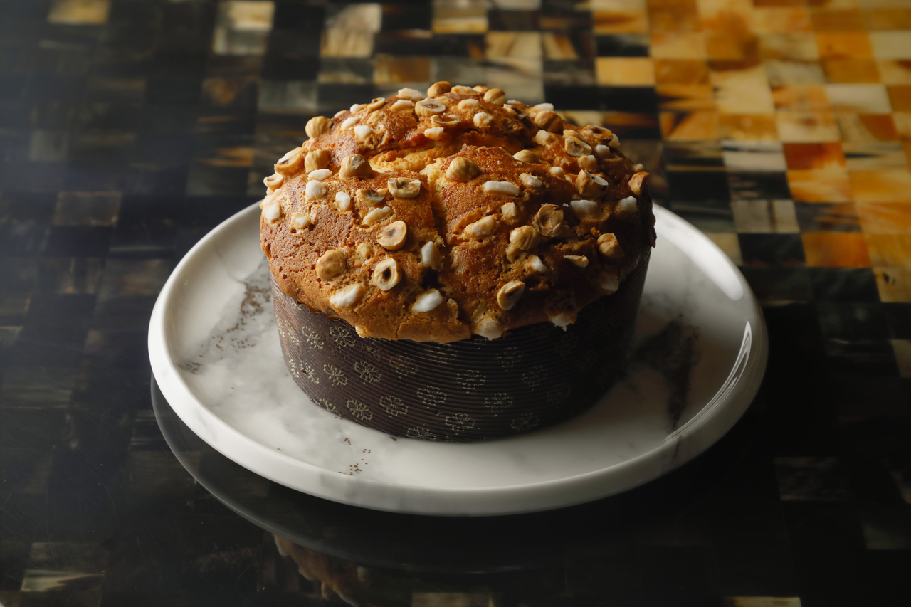 [天草晩柑のパネトーネ]当ホテル特製のパネトーネは、福岡県産のこだわりの小麦と自家製天然酵母を使用し、熊本県産天草晩柑の贅沢なペーストを練り込み、ふんわりと焼き上げました。ヘーゼルナッツやマカロン生地でアクセ