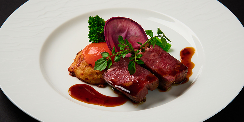 ・Grilled Japanese Beef Tenderloin with Périgueux Sauce, accompanied by Gratin Dauphinois