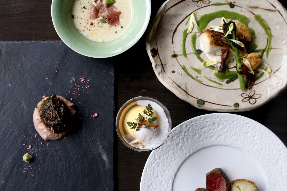 Mackerel saltimbocca, taro croquette, Yamagata pork loin jumbo no, honey mustard sauce, sweet potato and pear soup, BORA kadaif wrapped, tonnato sauce, domestic beef fillet roti, seasonal warm vegetables, mushrooms and soft-shelled turtle, soup stock, purple sweet potato and apple Brûlée cheese-flavored pie stick after-meal drink *The photo is for illustrative purposes only. *Contents may vary depending on the day.