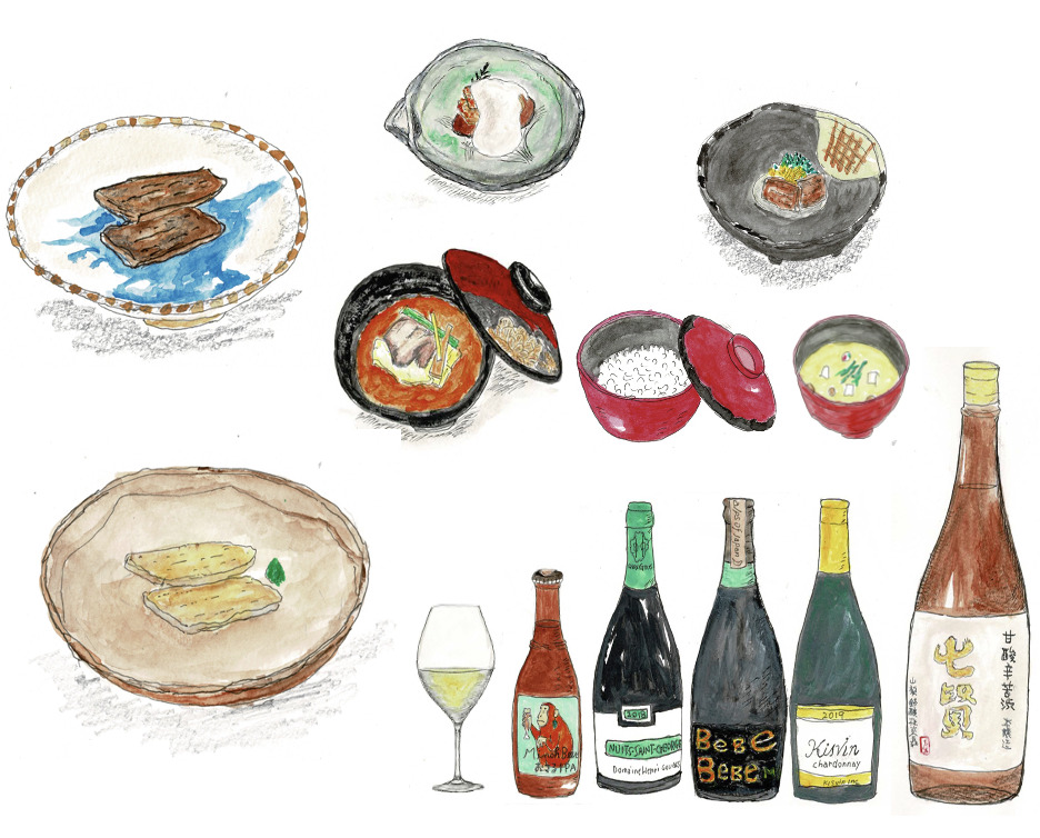 熟成の鰻と季節の食材を使った特別ディナーコースと日本酒・ワインのペアリングのセットです。