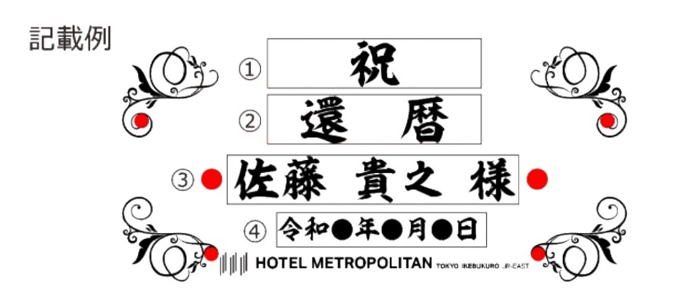 【エチケット部分に入れる文言をご入力ください(例:①祝 ②還暦 ③佐藤 貴之 ④2025年10月1日】