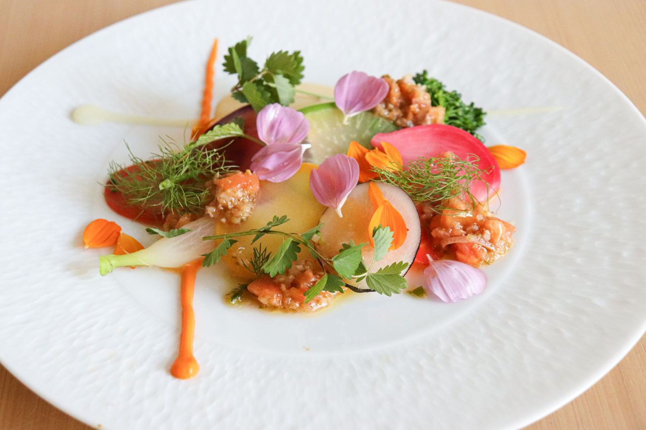 ・富士山サーモンのリエット 伊豆産カリフラワーと金時人参のピュレ 静岡産野菜のガルグイユ
