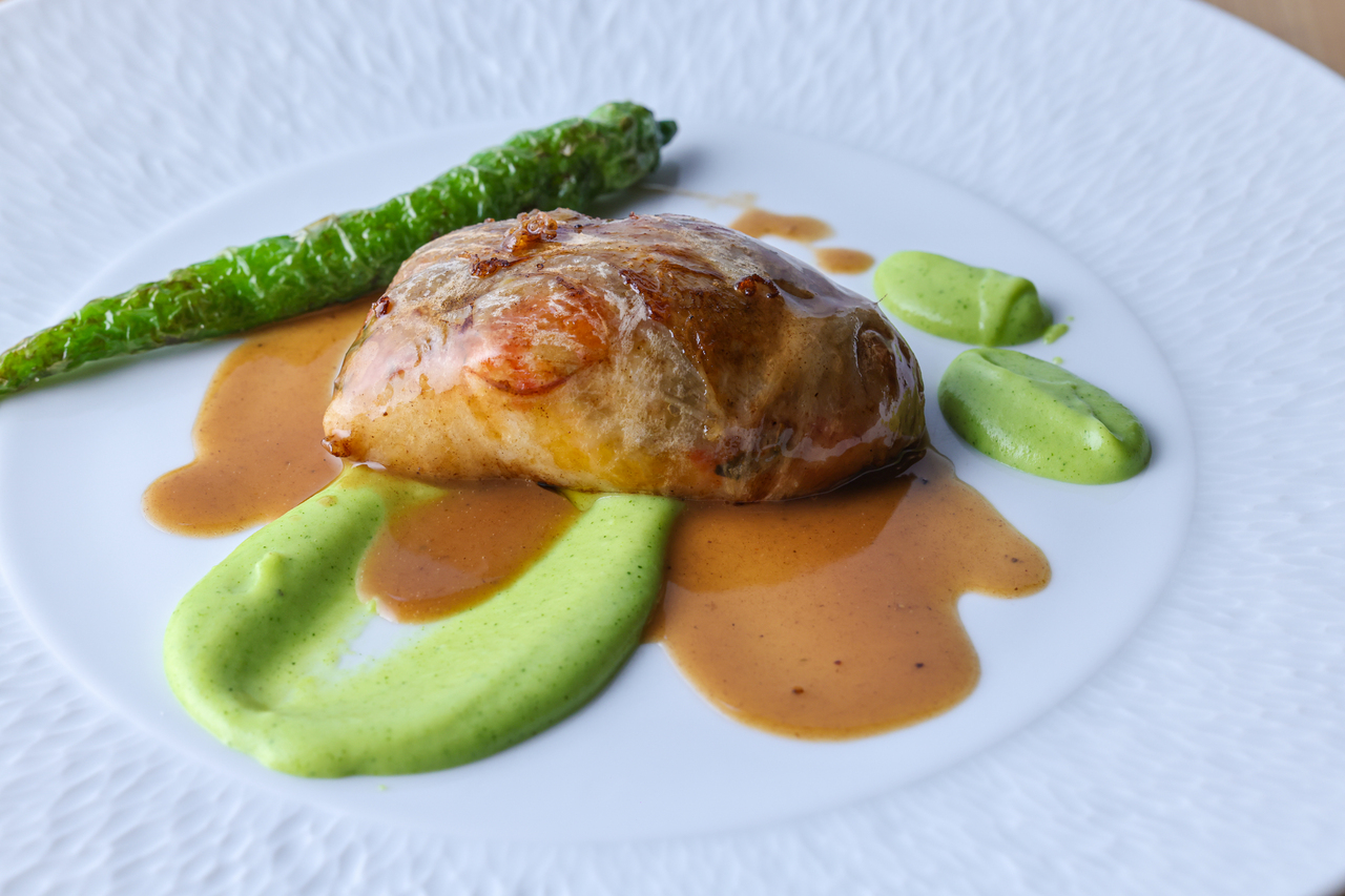 ・北海道産真フグのロティ ピサラディエール風 伊豆産トマトのタルト 静岡産春菊のサラダ フレッシュタイムのジュ