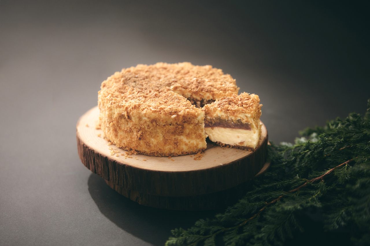 This luxurious two-layered cheesecake is made with a rich baked cheesecake topped with refreshing lime-scented rare cheese. A subtle rhubarb compote is hidden inside, creating an exquisite harmony of tartness and rich cheese flavor that fills your mouth. Finished with a fragrant feuilletage crumb, it adds an accent to the texture and flavor, making it an elegant cheesecake perfect for a special Christmas moment.