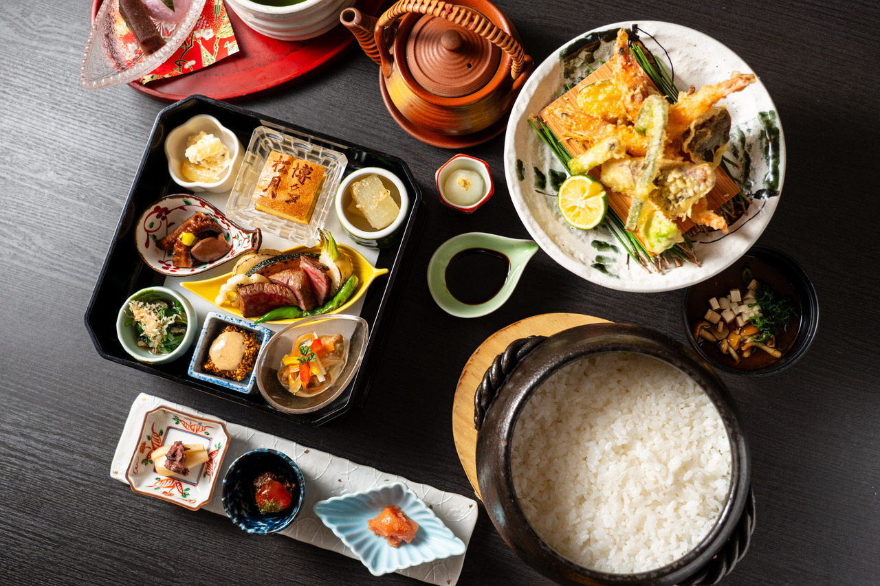 أسئلة لـ ≪Lunch≫ [Satsuma Gozen] Assortment of seven seasonal vegetables, seasonal fish, Kuroge Wagyu beef, and famous earthenware pot rice