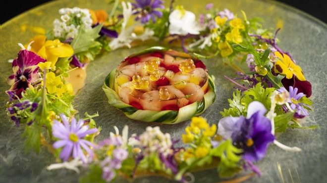 隠れ家のような外観を入るとそこにはモダンな空間が広がります。 そこでは、日本ならではの食材を使った華やかな料理とワインのマリアージュをお楽しみ頂けます。 御接待や、ご友人との会食、デートなど様々な用途で安心してお使い頂ける空間をご用意しております。