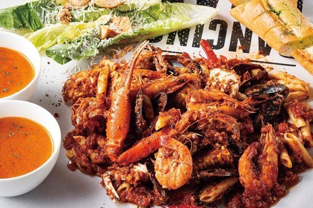 カニやイカ、ムール貝に野菜、ベーコンなどを茹でて、ソースに絡めたメインメニュー「クラブバッグ」(2~3人前、6500円)。ソースは、ダンシングクラブおすすめのシグニチャーソース(トマトピューレにケイジャンスパイスとチリソースを加えたスパイシーなソース)やクリームソースなど3種類の味からお選びいただけます。 サラダやフライなど、サイドメニューも手づかみで食べられるものがたくさん! 皆さんでワイワイ楽しいひとときをお過ごしいただけるので、パーティーやお祝いにもぴったりです。