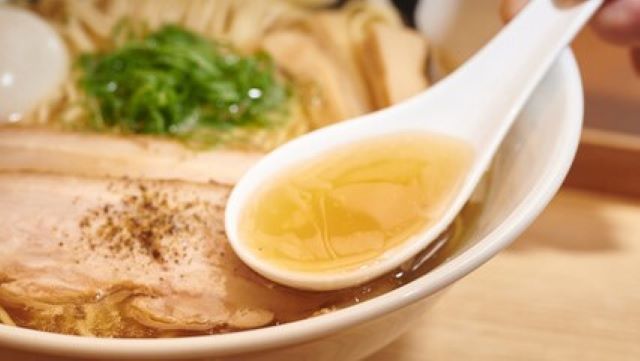 A rich broth combining the flavors of duck and chicken, enhanced with elements like clam meat and shiitake mushrooms. The addition of prosciutto as a finishing touch provides a refined and elegant taste with a savory depth, even without soy sauce. Enjoy the beautifully presented dish in a clear golden broth, served in a pristine white bowl adorned with elegant lotus patterns.