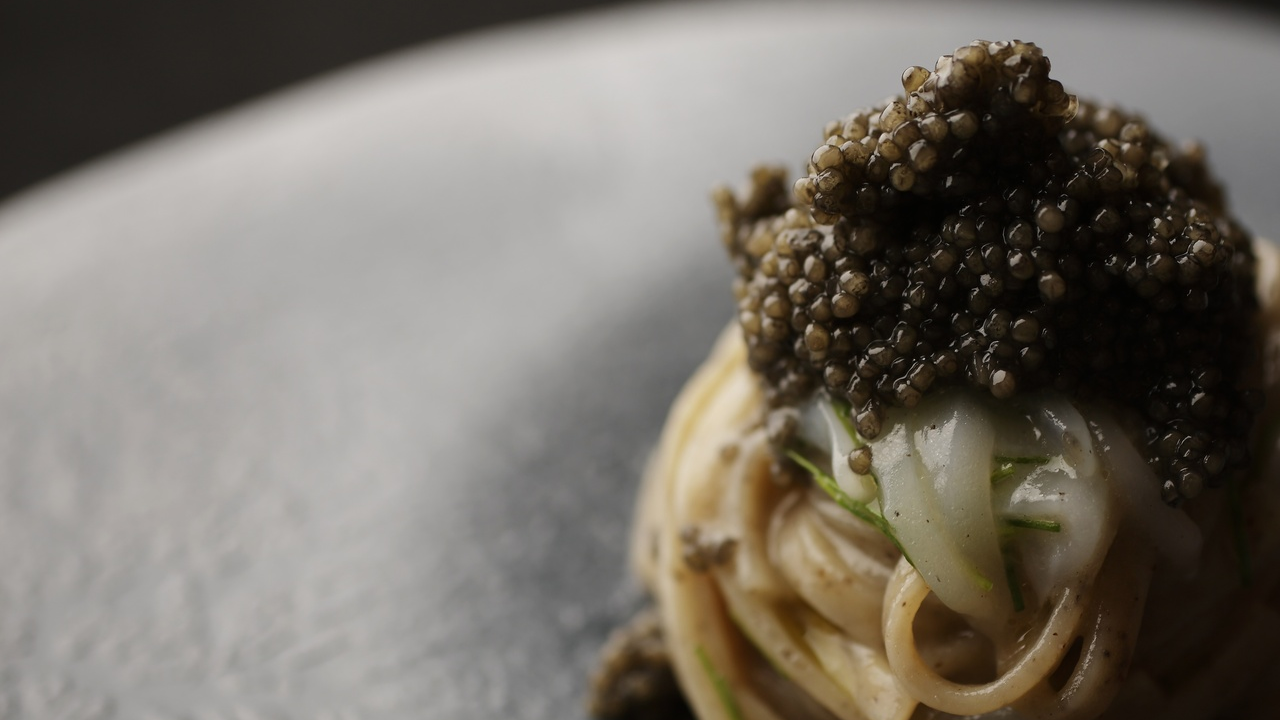 Amuse-bouche Marinated Botan Shrimp with Benishigure Daikon and Ossetra Caviar Hokkaido Oyster and Pear Cocotte Gratin Beef Oxtail Stufato with Turnip Pasta, Truffle Aroma Wood-fired Roasted Takikawa “Snow White Chelberry” Duck Breast (Hokkaido) Strawberry Parfait Coffee or Tea Financier