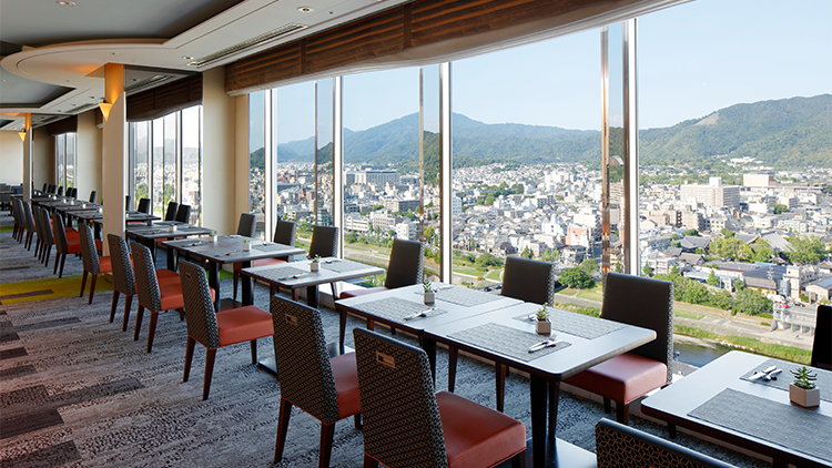 ホテルオークラ京都の最上階にあり、60mにわたってガラス張りになっているため、眼下に広がる鴨川や東山などのパノラマビューを眺めながらゆったりと流れる時間をお過ごしいただけます。ランチ、ディナーのいずれも、シェフが腕によりをかけて旬の食材を京風にアレンジした料理をご堪能ください。