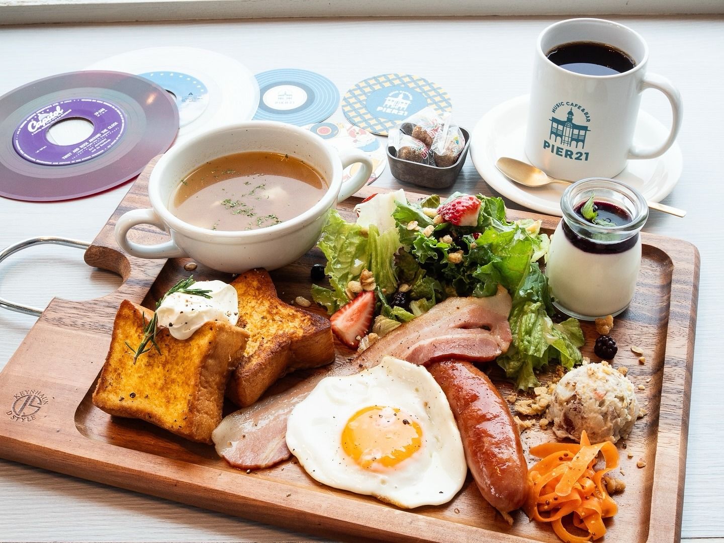 PIER21 MUSIC CAFE & BAR in Yokohama Minato Mirai is on the second floor of the floating "Pukari Pier." By day, enjoy nostalgic café favorites like cream soda and Napolitan pasta in a retro Showa-style setting. At night, relax with craft beers and cocktails while listening to vinyl records and admiring views of Yokohama’s waterfront and night skyline. A perfect spot to enjoy music, drinks, and scen