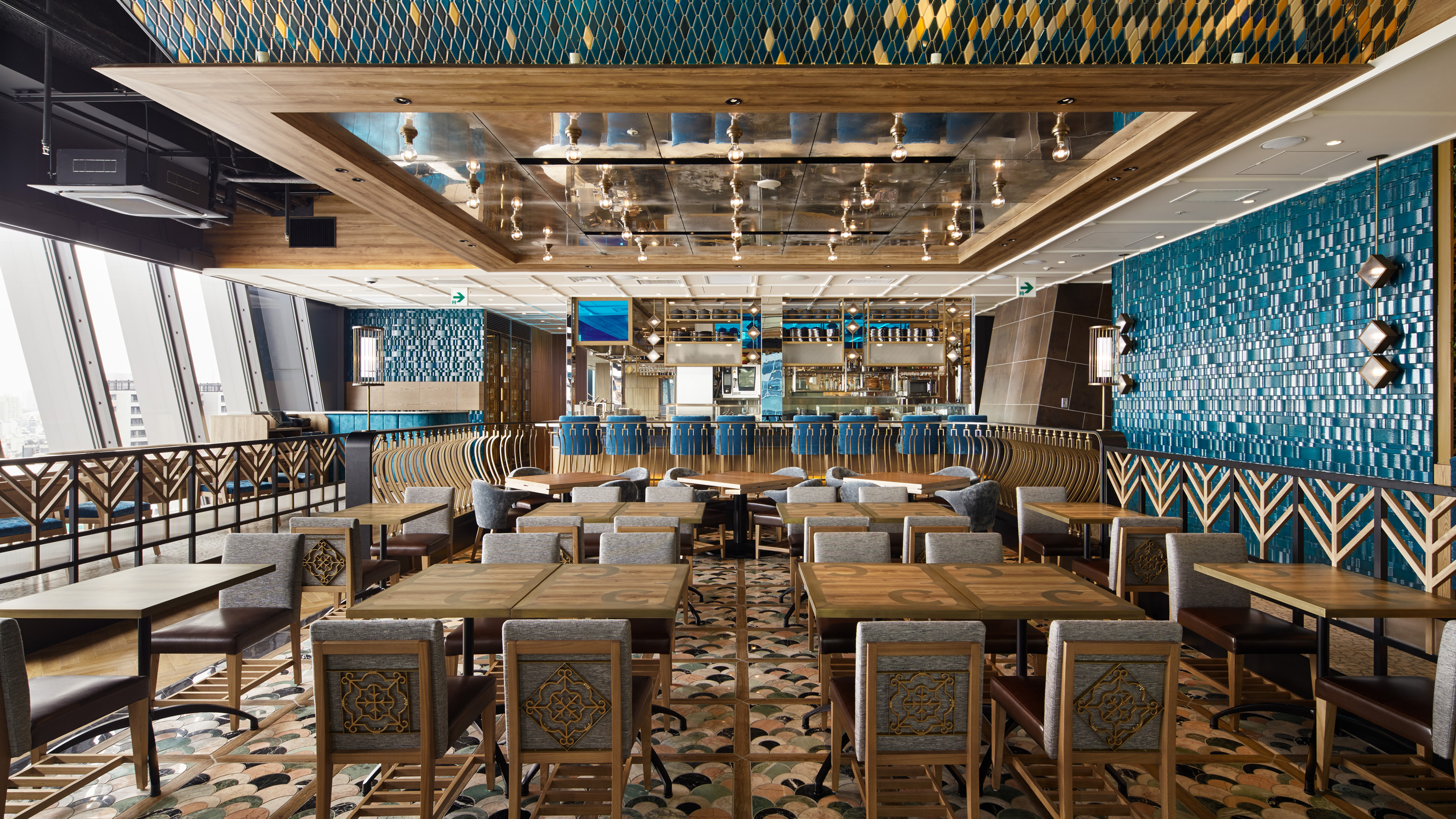 Brilliant use of color from Europe.Arabesque pattern from the Middle East. Through the ironwork ,we can experience Spanish decor.You can feel the Spanish culture through the decor.There are many sea elements everywhere,The Ammonite object in the entrance made of marble, the shell shaped tiles, and the bright blue wall expressing the wave.