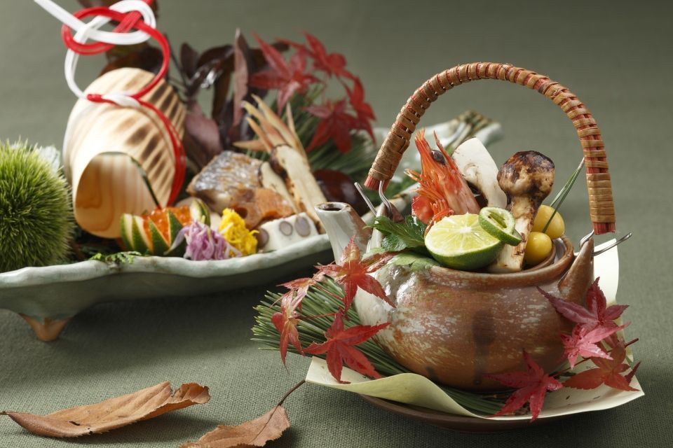 Equipped with private and semi-private rooms, the elevated restaurant boasts a view of the shrine by day and the sea of lights by night. An example of a kaiseki course in September and October includes matsutake mushrooms steamed in a dobin (teapot) and grilled fish marinated in a citrus-flavored sauce. Other fine delicacies and rare varieties of sake are available for special occasions.