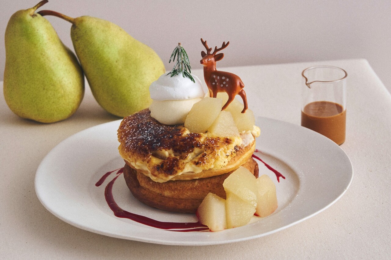 Fragrant fresh pears topped with sweet, melt-in-your-mouth burnt brulee. A slightly bittersweet caramel sauce brings the whole thing together for a rich, luxurious flavor. These heart-melting pancakes are perfect for a winter afternoon.