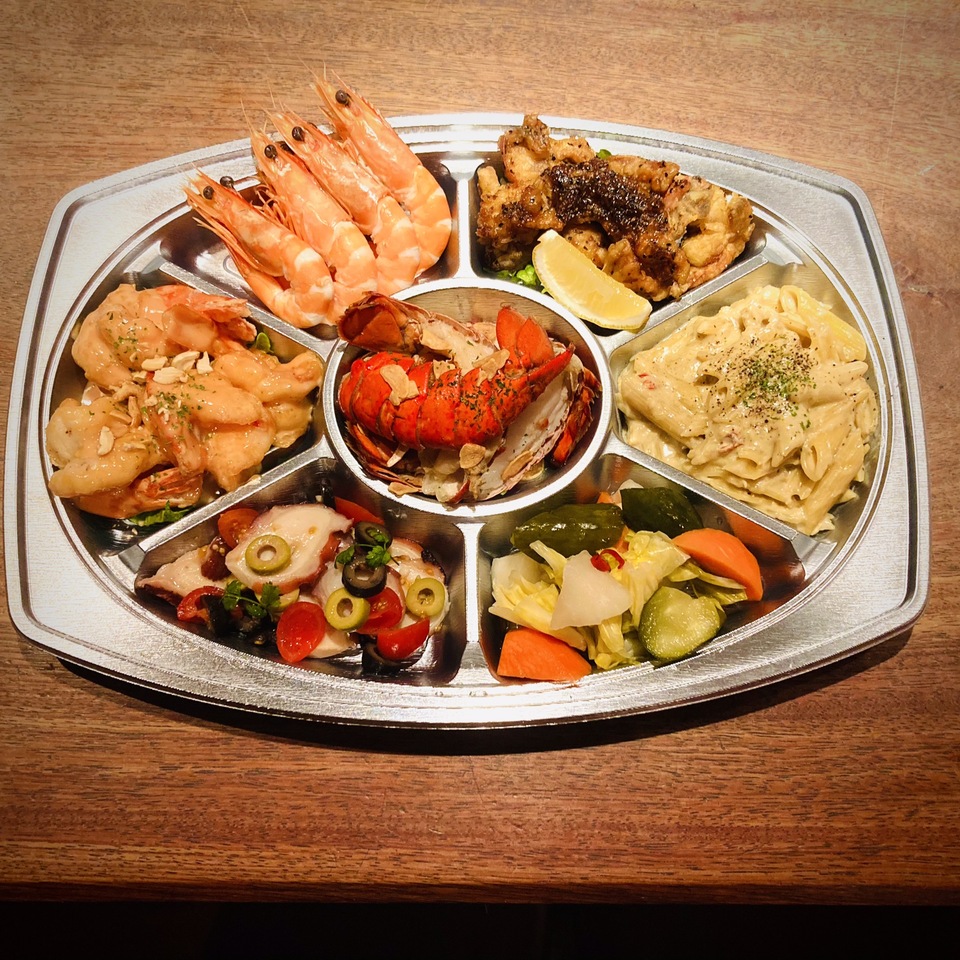 ①オマール海老のガーリックバターソテー、②タコとオリーブのマリネ、③自家製ピクルス、④ソフトシェルクラブのブラックペッパーソース、⑤釜茹でシュリンプ、⑥大海老のエビマヨ、⑦ズワイガニとカニミソのクリームペンネ