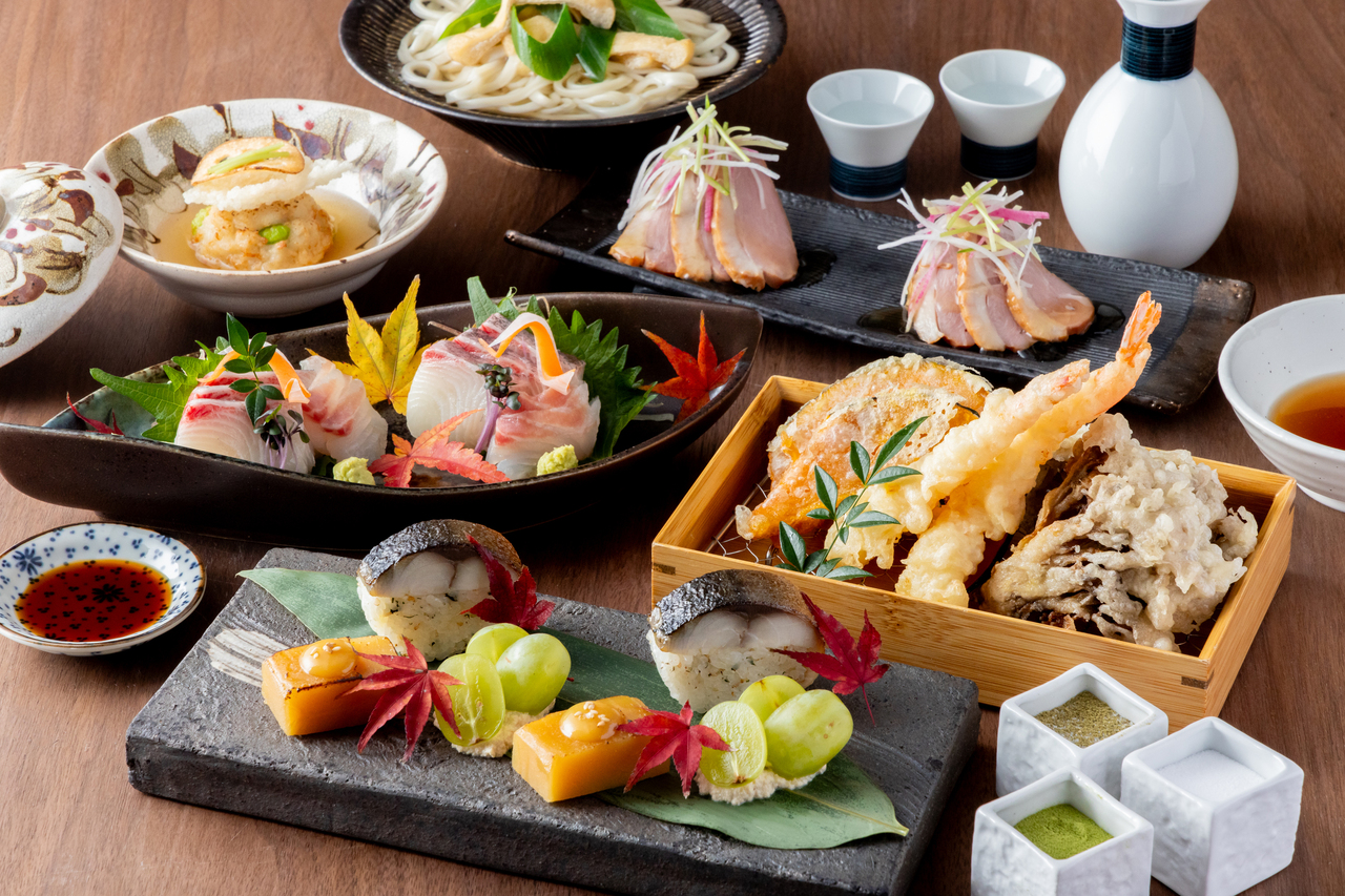 季節の賑わい感じる前菜やお刺身、天ぷらなどいい乃じの逸品を詰め込んだコースです。
