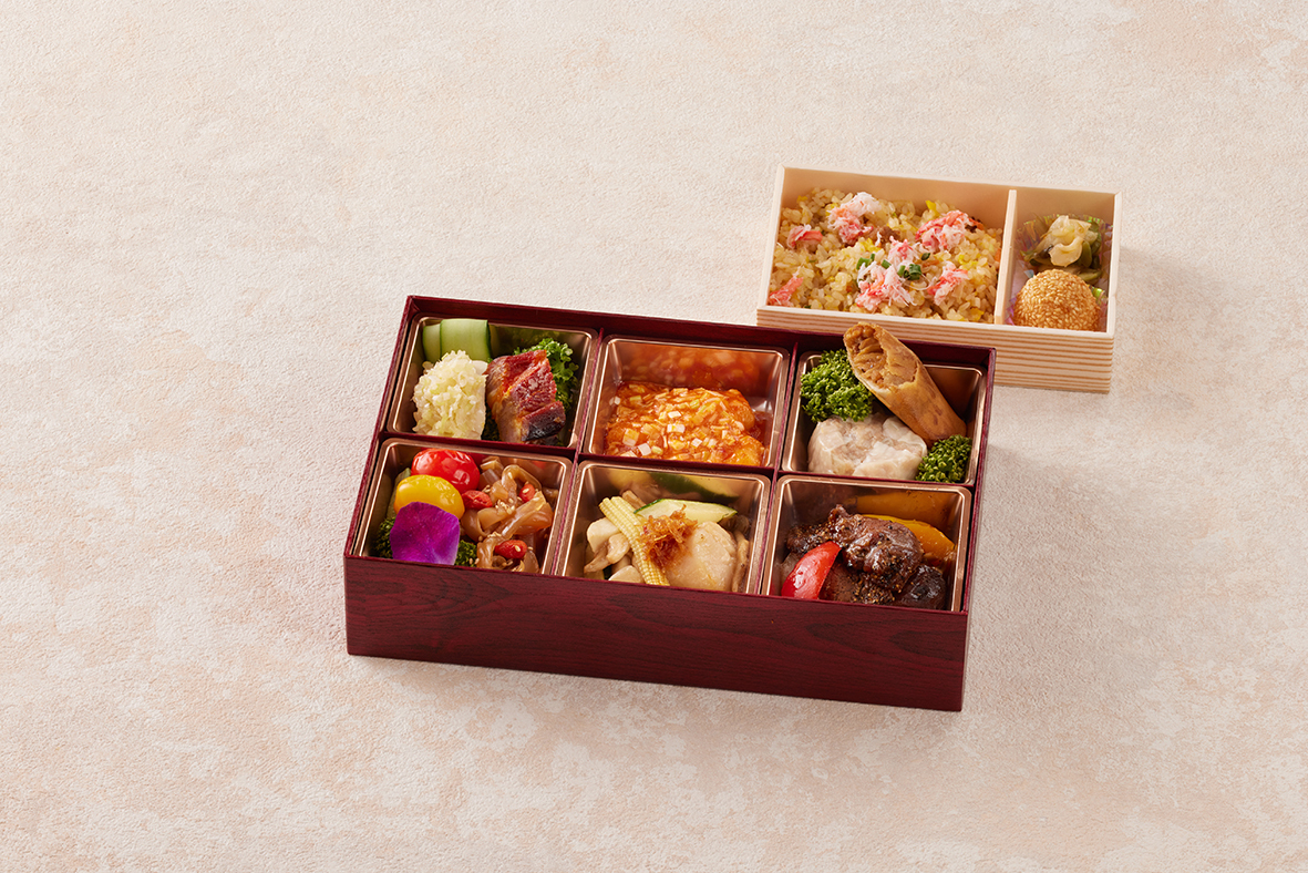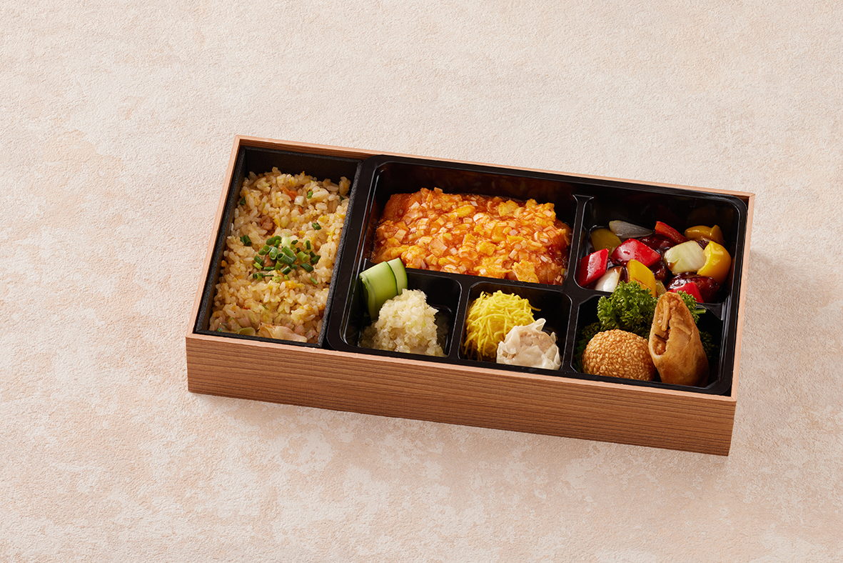 柔らかく仕上げた蒸し鶏をはじめ、中国料理定番の海老のチリソースやチャーハンがついた特製弁当