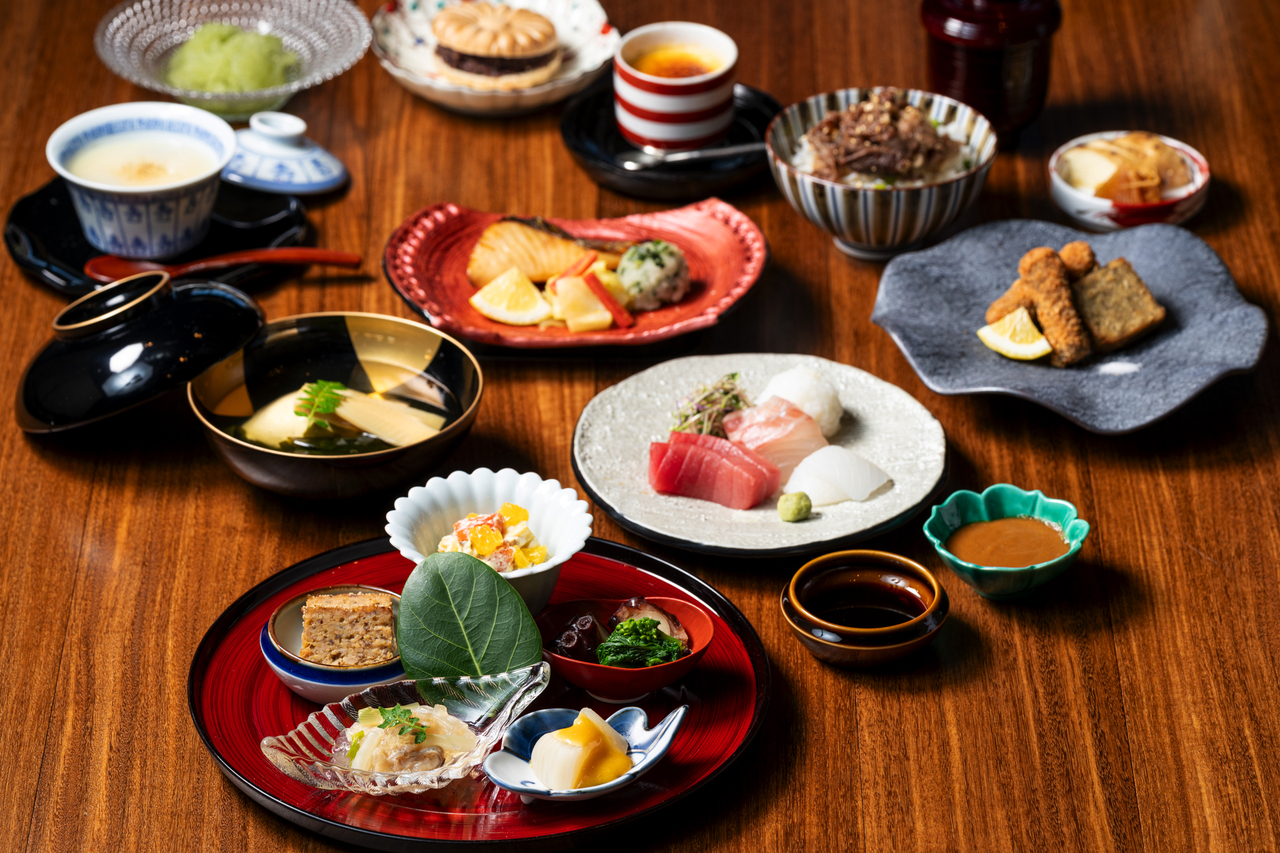 Eight small dishes, small bowls, main dish, rice, miso soup, pickles, dessert