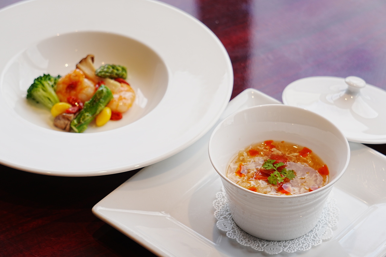 「発芽玄米入り中華粥」「県産雑穀粥」に海老料理や特製春巻など、彩り良くバラエティー豊かなお料理を週替わりでご用意しております。