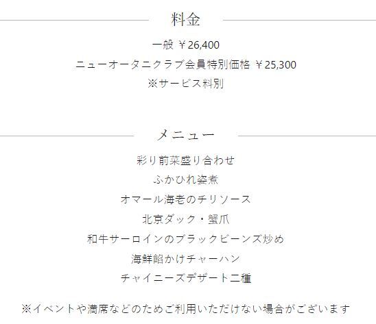 彩り前菜盛り合わせ / ふかひれ姿煮 / オマール海老のチリソース / 北京ダック・蟹爪 / 和牛サーロインのブラックビーンズ炒め / 海鮮あんかけ炒飯 / デザート二種