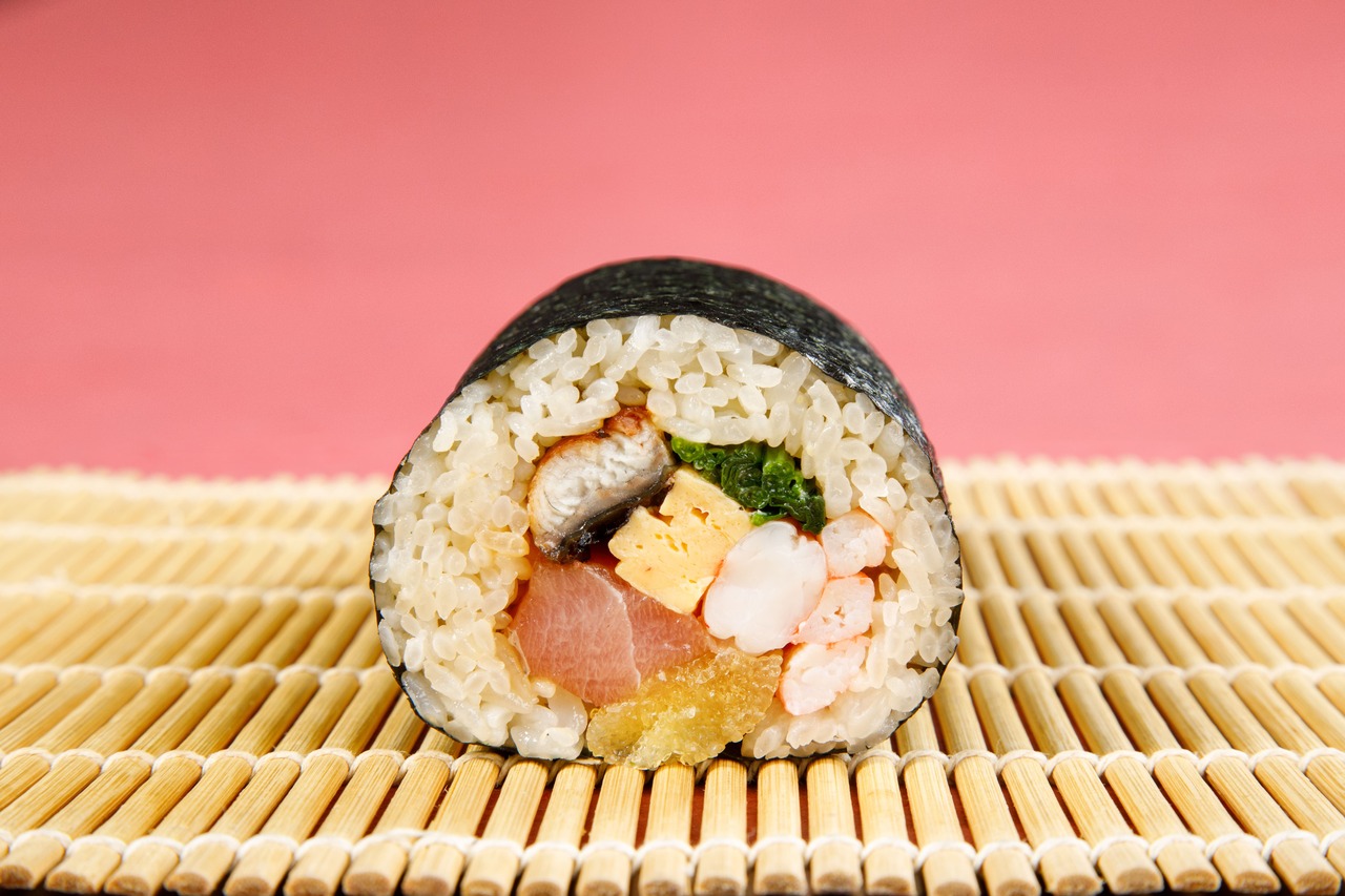 鮪、数の子、うなぎ、エビ、カニ、玉子、ほうれん草の七つの具材で巻いた都万麻謹製の恵方巻。