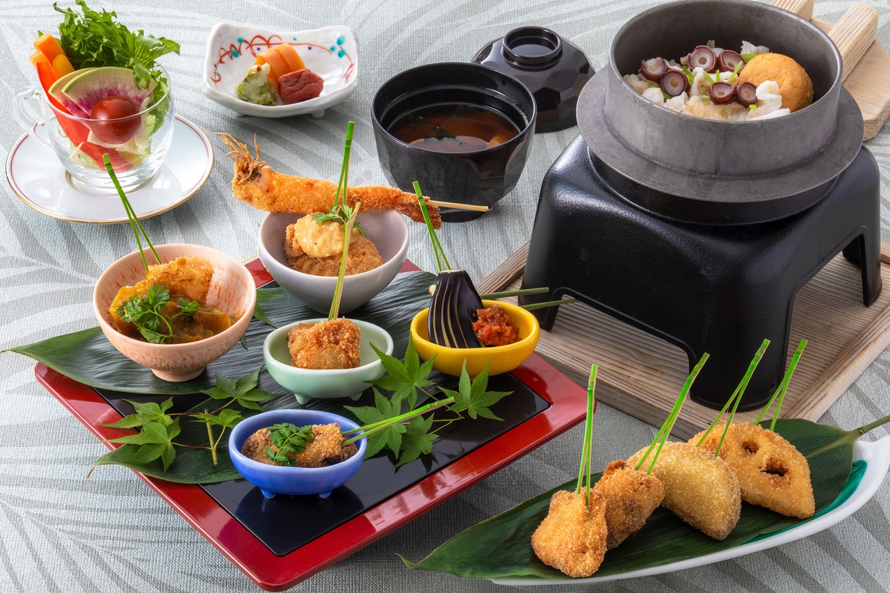 Skewers: Kobe pork with Japanese pepper sauce, Hyogo Prefecture eggplant with sweet and spicy sauce, Awaji onion curry flavor, miso sauce dumplings, ❝The ultimate game❞ Himeji Marugyo Suisan stingray fried shrimp, beef, and three other kinds Salad: Stick vegetable dish Side dish: Octopus rice, red miso soup, pickled vegetables Dessert: Sherbet