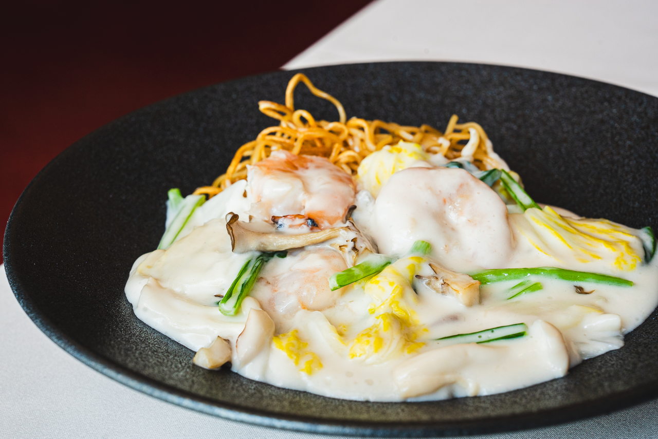 ぷりっとした海老とキノコを、まろやかなクリームあんで香ばしい麺に絡めた贅沢な一皿です。