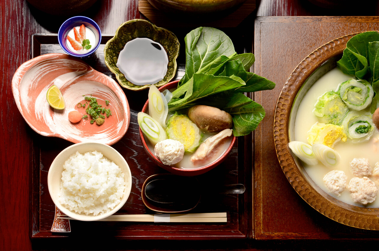 Mizutaki hot pot / Silver rice and earthenware rice / Pickles / Dessert