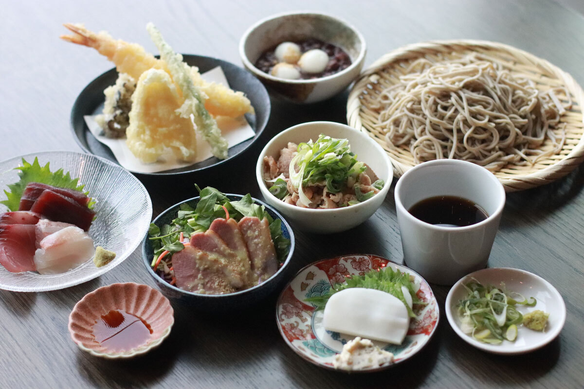Side dishes include a small bowl of pickles and negitoro (tuna shavings), as well as white rice or chicken rice, a choice of soba noodles (served in a bamboo steamer or with a topping), and a dessert (anmitsu).