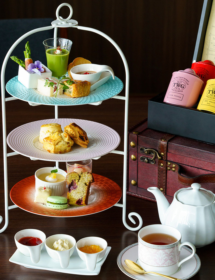サンドイッチやオードブル、デザートが彩る3段のスタンド、アフタヌーンティーのためのブルーナティエアンサンブルです。お一人様で1セット、ちょうどご満足いただける内容です。