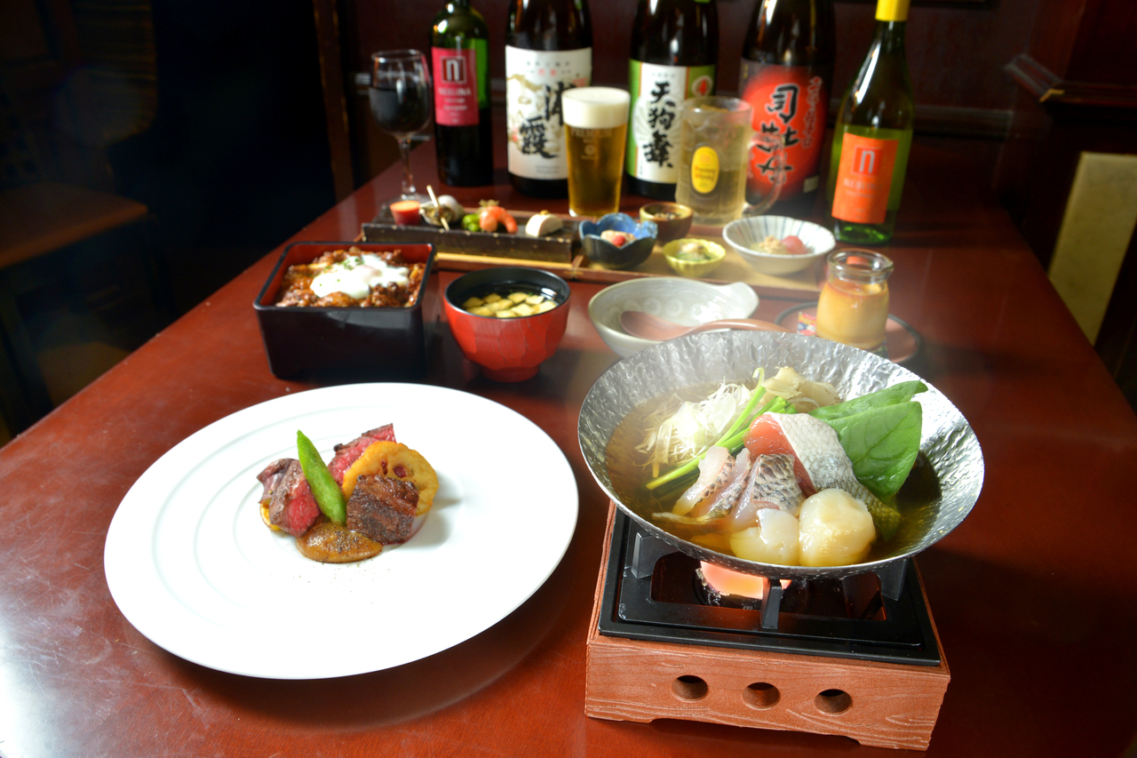 川俣しゃも すき焼き鍋・鮮魚カルパッチョ・佐渡 アカモクうどん・前菜・甘味など