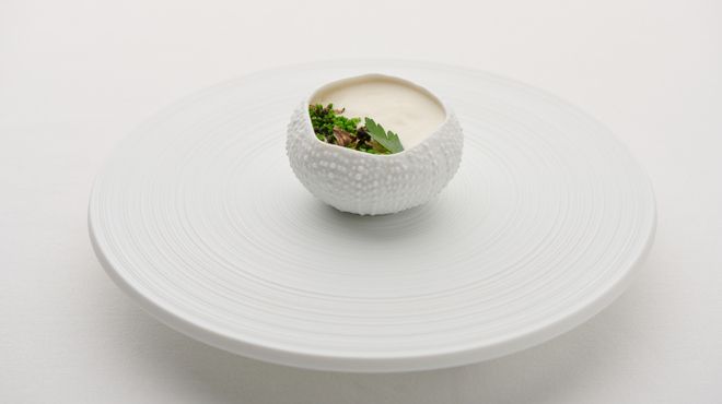 まるでシェフの邸宅に招かれたような店内で、食の錬金術師がゲストの知らなかった新たな美食の世界へ。山本氏は、京都のフレンチで修業後、2001年渡仏。リヨン・アルザス・バスク・ブルターニュなど8年間フランスの各地を周り修業。最後は【世界のベストレストラン50】でフランス勢のトップに躍り出た『ル・シャトーブリアン』で腕を磨いた。2008年12月に帰国し、2011年白金に『アルシミスト』を開業。食材を斬新に組み合わせ、美食家の想像力をも超えるひと皿に挑戦し続けている。