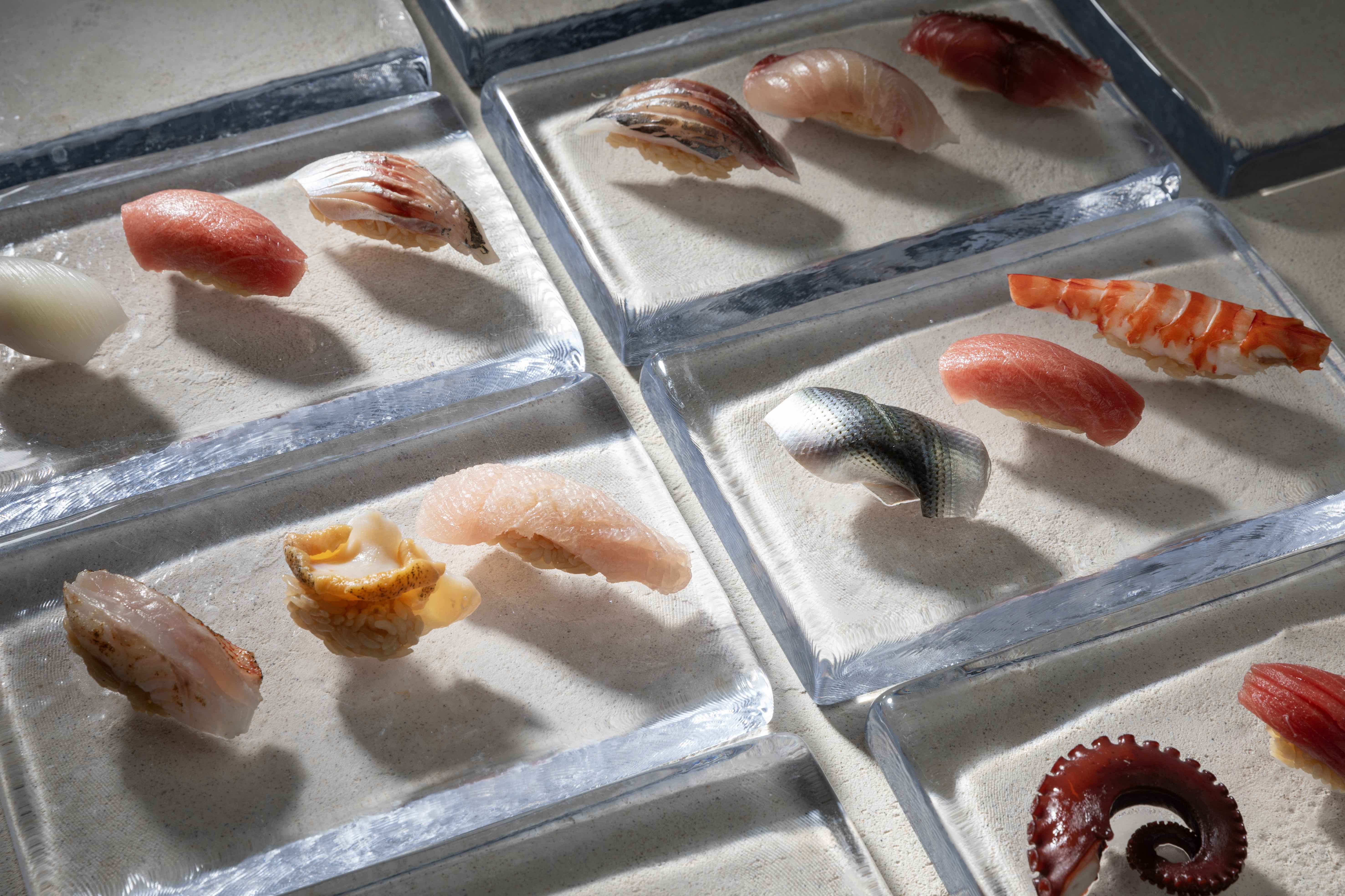 Appetizers two types of sashimi, two types of fried, three types of nigiri, shellfish nigiri, grilled scallops with seaweed, tiger prawn nigiri, appetizers: sea urchin and salmon roe, two types of tuna, fatty tuna rolls, ramen