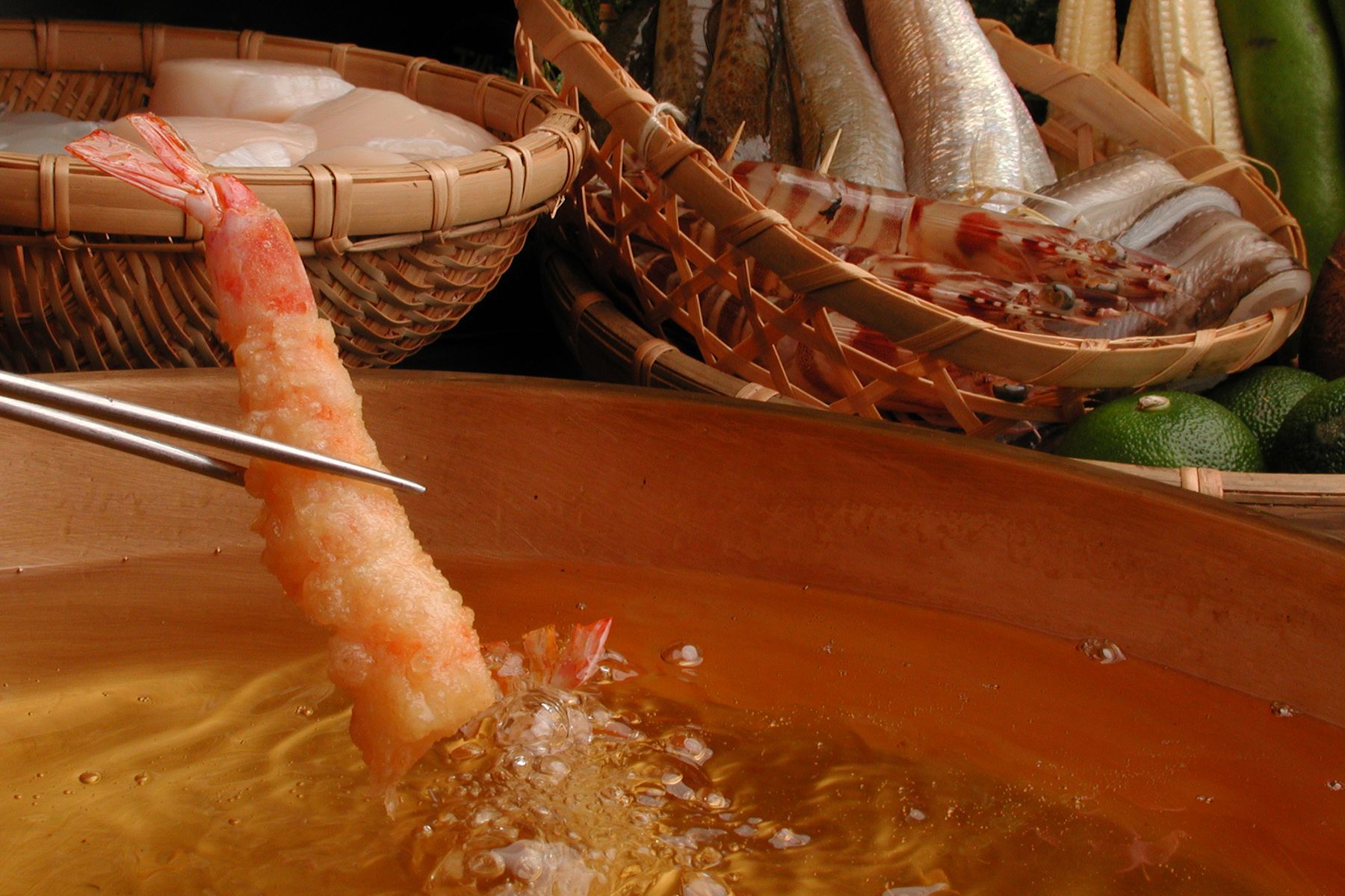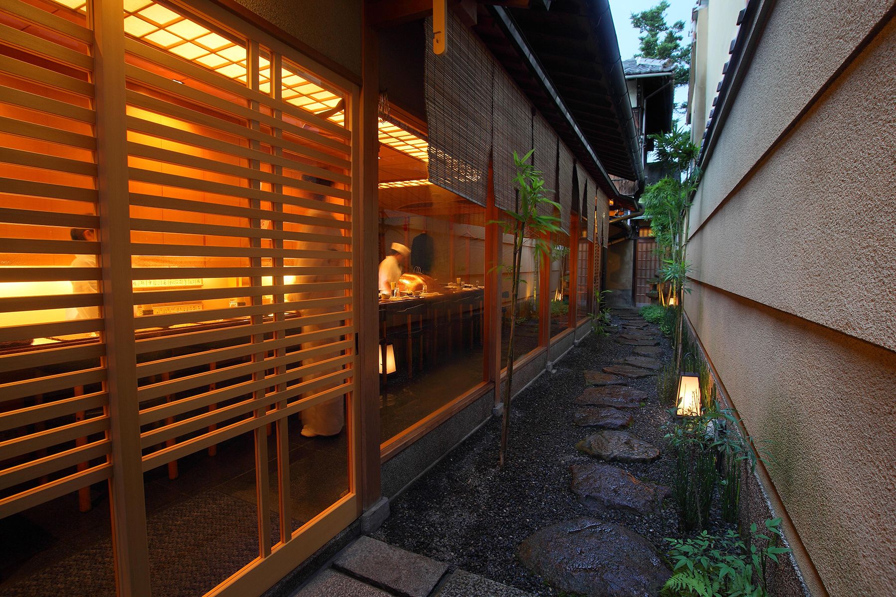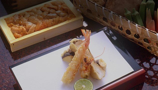 打ち水が涼しげな石畳の路地に面した和風カウンター席では、京都祇園の豊かな食材を目の前で揚げたての天ぷらとしてお楽しみいただけます。数奇屋造りの個室では、坪庭を眺めながらご接待や商談に最適です。京野菜や山菜、瀬戸内の魚介など、軽くあっさりした名代の京風天ぷらをぜひご堪能ください。