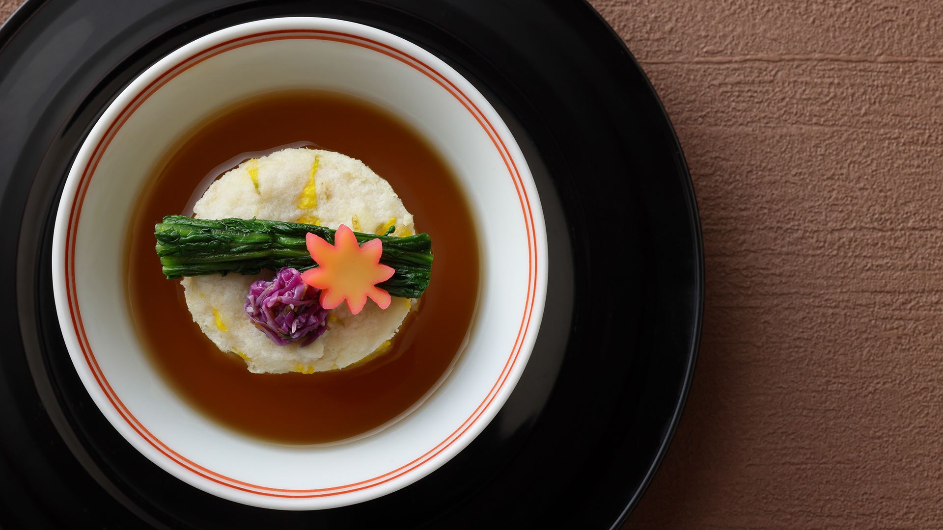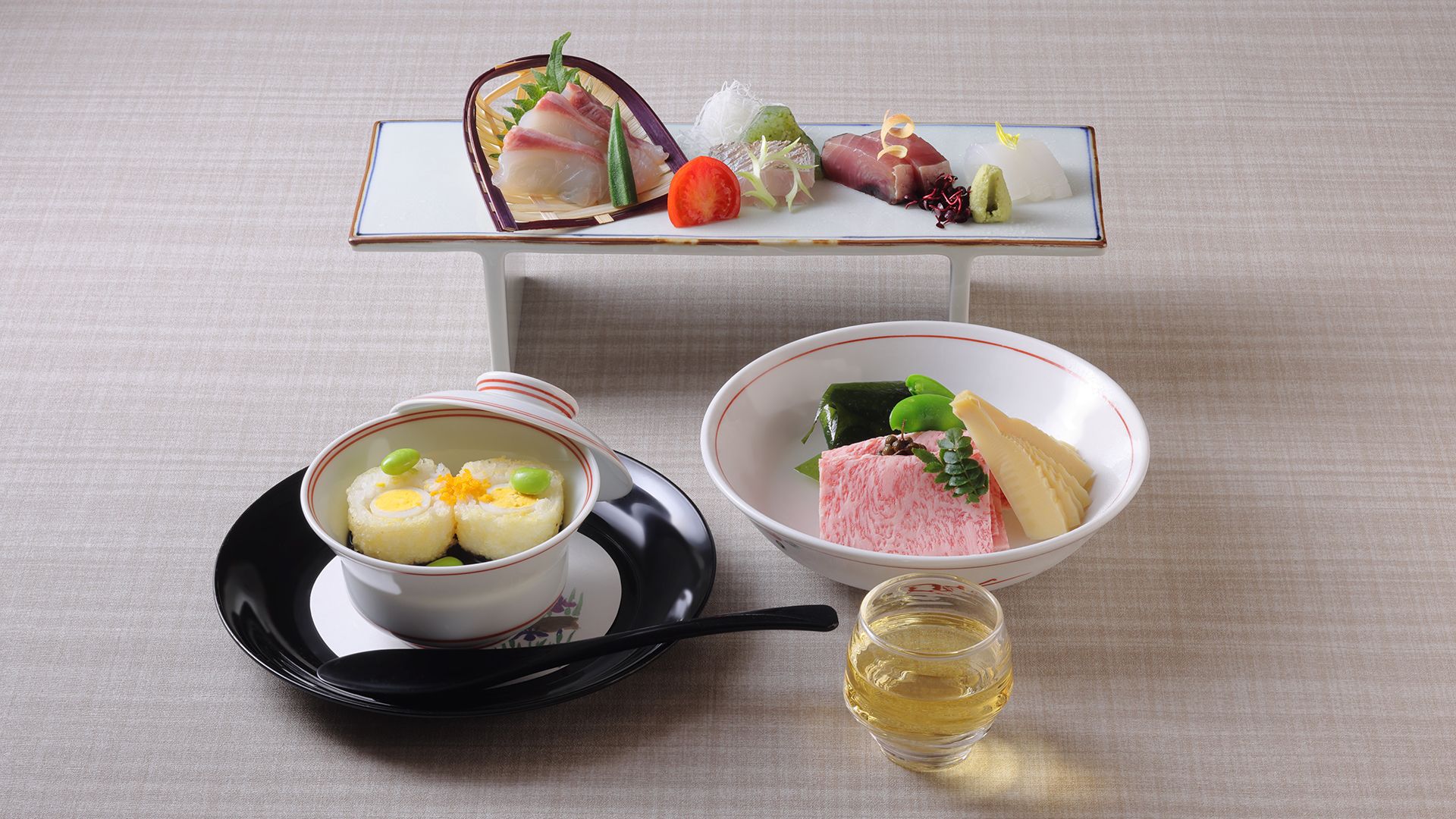 Steamed Dishes: Clam Tenderloin Main Dishes: Japanese Black Beef and Spring Vegetable Hot Pot Rice: Nara Chameshi (Nara Tea Rice) Covered Dishes: Simmered Fish Pickles: Yamato Sanjaku-kyu (Three-foot Cucumber) Pickled in Narazuke (Nara Pickles), etc. Simmered Soup: Country Miso Desserts: Fruit and Desserts
