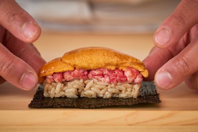 At "Beef Sushi Kintan," you can enjoy beef sushi made with more than 20 different cuts, as well as the specialty sea urchin hotdog. In a refined space decorated with white wood and gold, you can fully enjoy exquisite cuisine that stimulates all five senses.