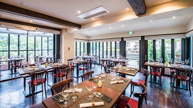柔らかい照明が光る店内は、解放感ある広々とした空間。フィオーレの森の中庭を眺めるテラス席は人気ですので、予約がおすすめです。オープンキッチンのカウンターは、目の前で調理技を堪能できる特等席で、おひとりでも気軽に食事を楽しめます。メニューには、彩り野菜のテリーヌやパスタランチなどをご用意。そば粉を使ったガレットなども人気ですので、白ワイン・ヴァルモンと一緒にお楽しみください。