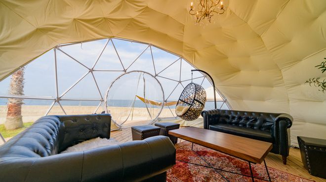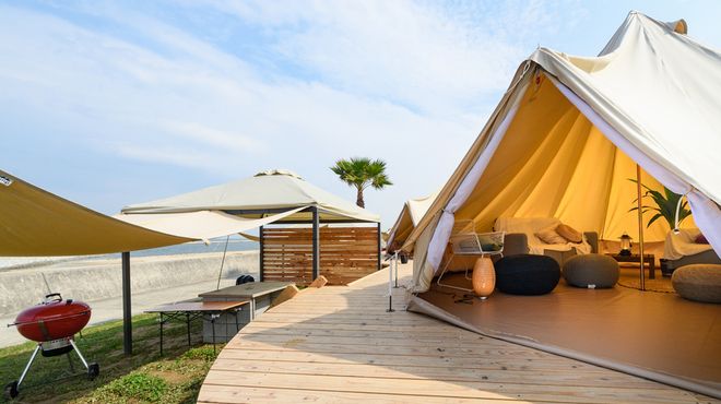 An ocean view site with a beautiful sunset. You can enjoy BBQ casually in the bell tent.・Number of sites: 4 sites (private rooms) ・Number of people: 2 to 10 people per site ・Auto camping specifications (1 parking space available) ・Pets allowed ・No air conditioning