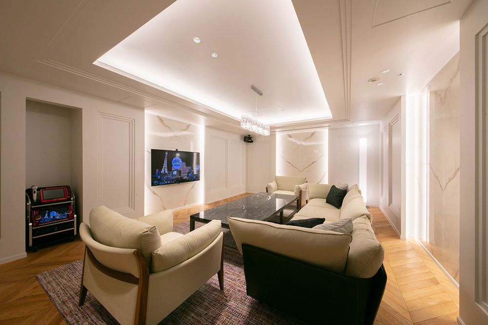 白を基調にした華やかな雰囲気は、ワンランク上の寛ぎの時間が流れています。 カラオケラウンジとしてはもちろん、プライベートな会議や打ち合わせなどにもご利用いただけます。