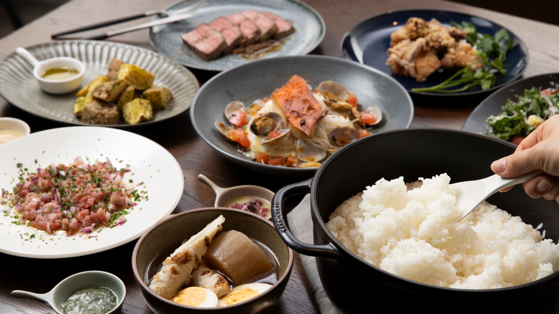 ・Roast Beef and Kale Salad ・Kalpaca Tea ・Assorted Appetizers ・Fried Eggplant in Marinated Sauce ・Wagyu Beef Sukiyaki Hot Pot ・Bluefin Tuna Rare Cutlet ・Freshly Steamed Rice ・Two Rice Side Dishes