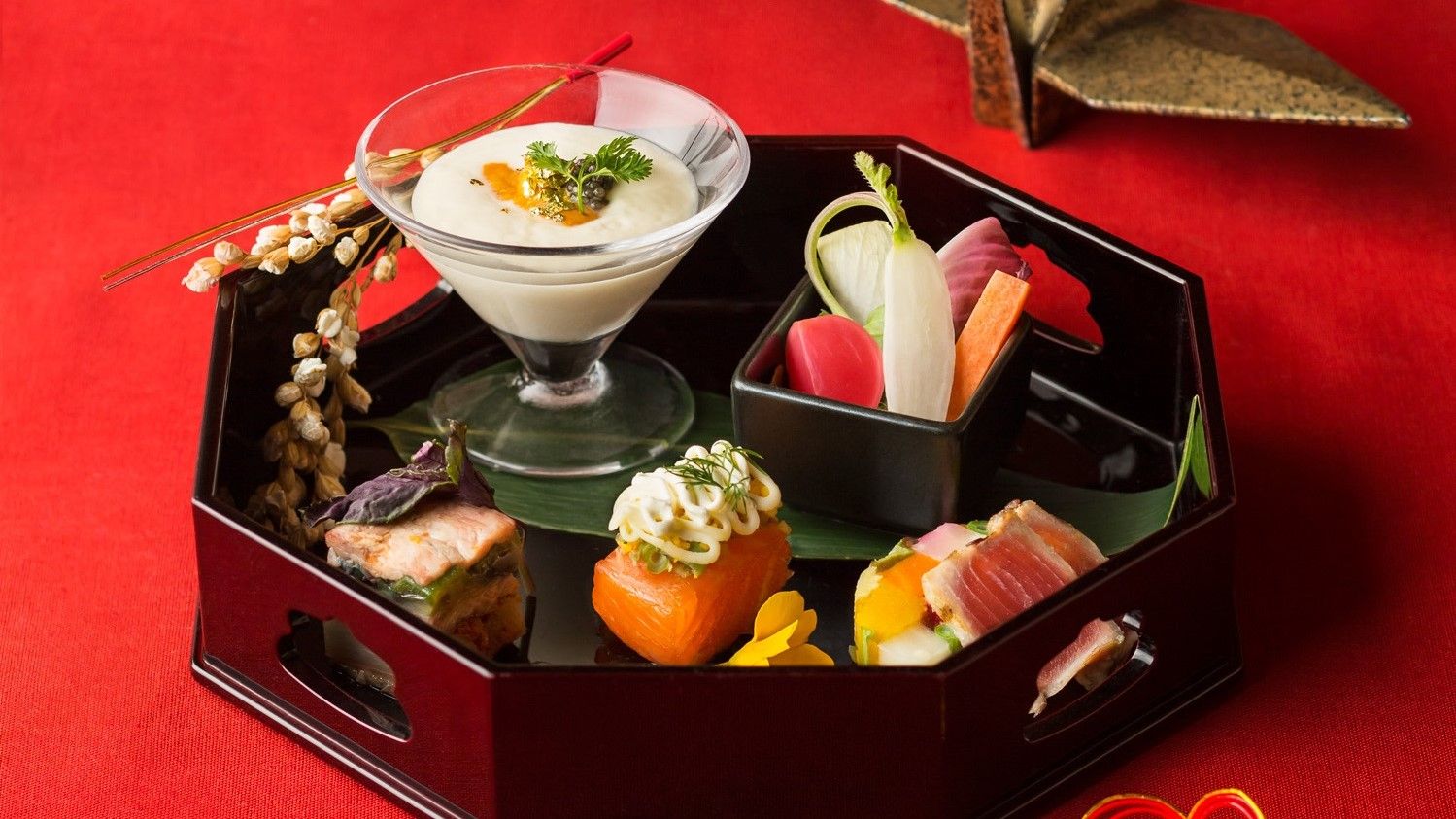 ■ Winter Yellowtail Mandarin Marinated with Damier Daikon Radish, White Balsamic Vinegar and Honey ■ Chestnut and Lily Root Potage, Milt Meunière ■ Lobster and Chinese Cabbage Braise, Jerusalem Artichoke Chips, Jude Crostian ■ Roasted Japanese Black Beef Loin, Winter Root Vegetables, Jude Crostian, Cocoa Flavor ■ Pa Chef's Special Dessert ■Bread & After-Dinner Drink