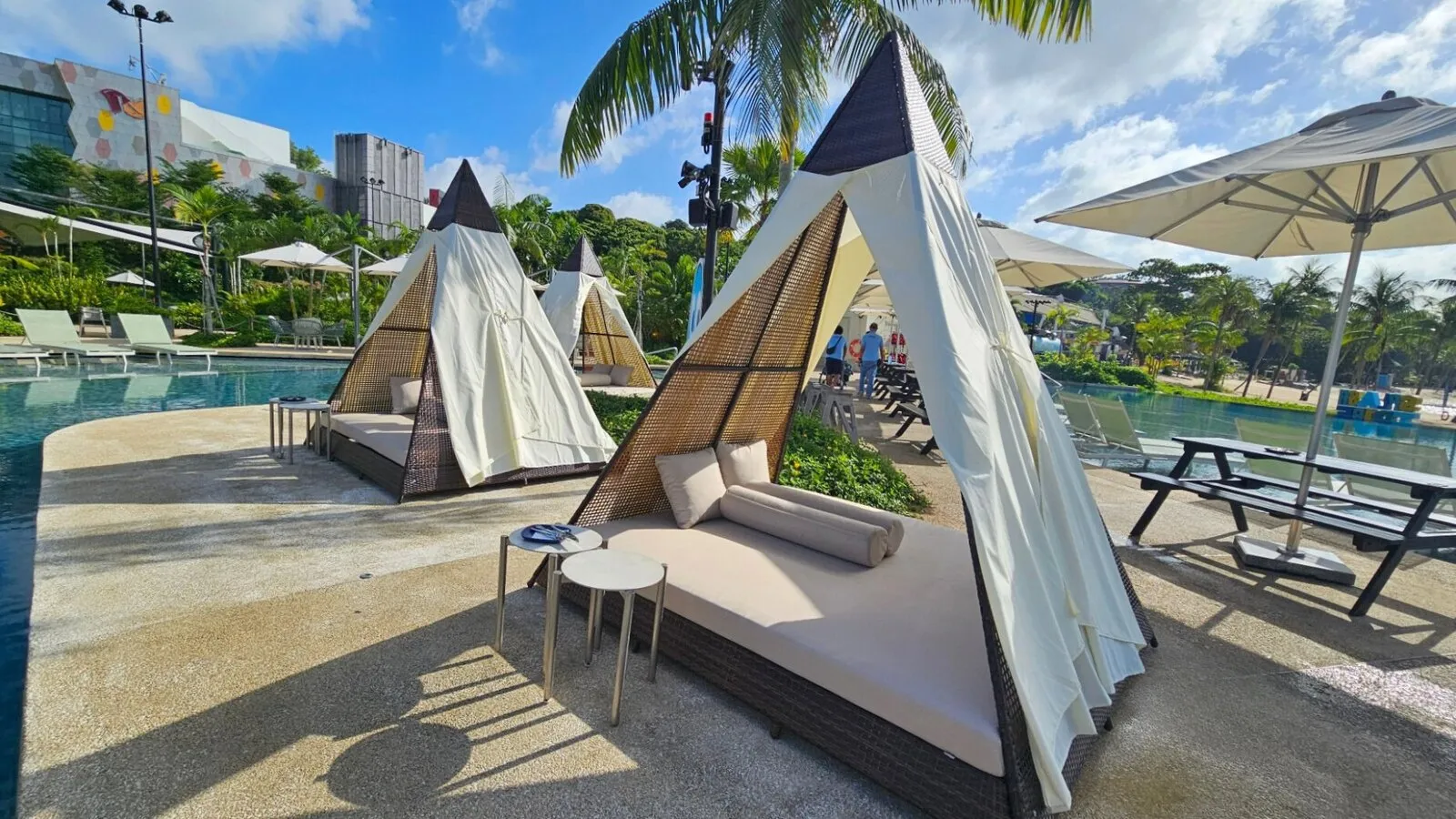These cosy teepee tents on the poolside deck offer access to the infinity-edge pool within steps, soft mats for lounging comfort, and a touch of privacy, perfect for relaxed, shaded chilling within the beach club.