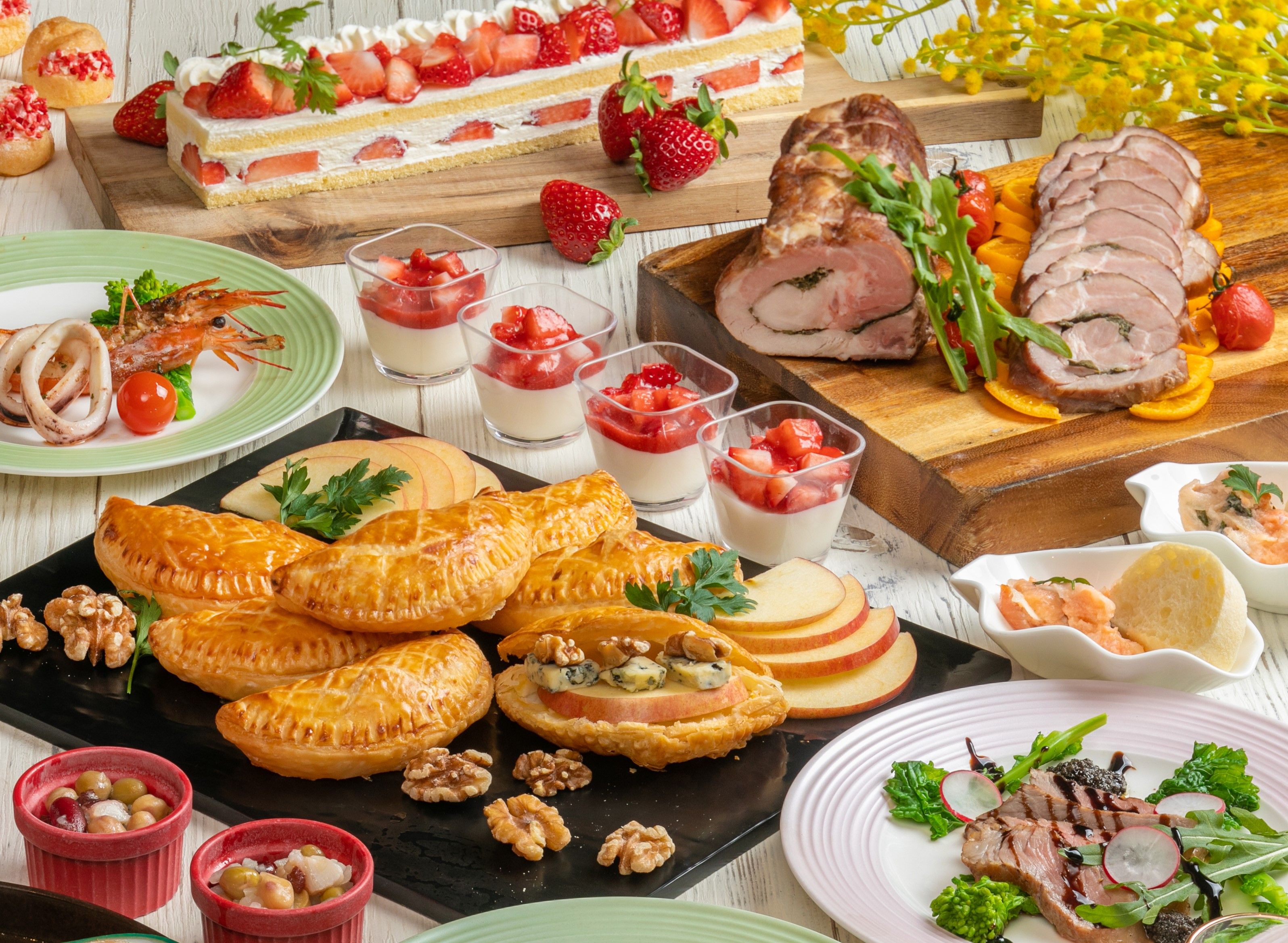 ローストビーフや握り寿司の数々など出来立てのお料理をパフォーマンスとともにおしゃれでわくわくした時間をお届けいたします。 四季折々の食材を使用した五感で楽しむブッフェをご堪能ください。 お誕生会やご家族の集まり・会社のグループでの懇親会など飲み放題もご用意しておりますので少人数から大人数のお集りまでご利用いただけます。