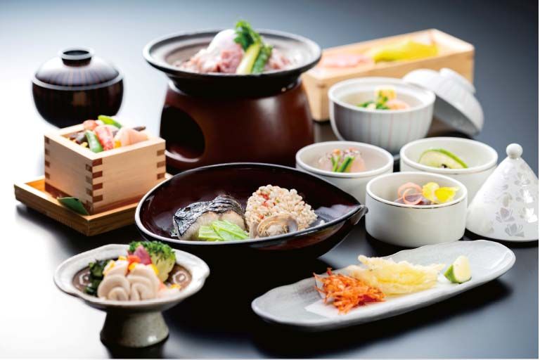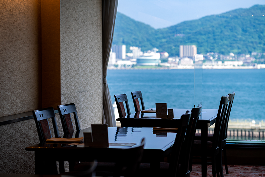 関門海峡の美しい景色と共に、季節の新鮮な海の幸と山の幸を贅沢に味わえる日本料理をご提供いたします。料理長の厳選した食材を使用し、見た目にも美しい一皿一皿が、五感を刺激します。特に、鰆の焼き浸しや、アスパラ豚巻き天婦羅は絶品です。どの料理も、素材の持つ豊かな旨味を最大限に引き出す調理法で仕上げられております。