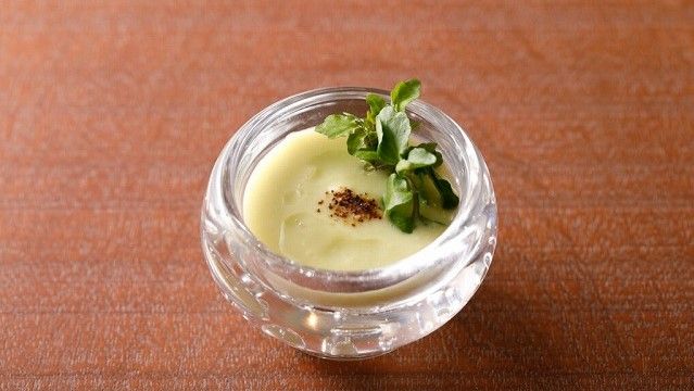 An example of a day Amuse Chilled Green Asparagus Soup with White Truffle
