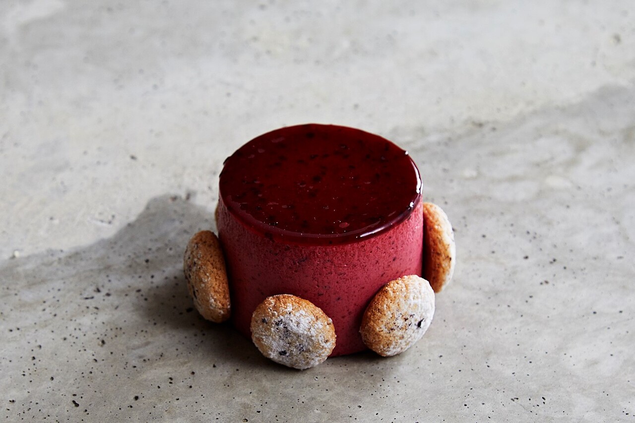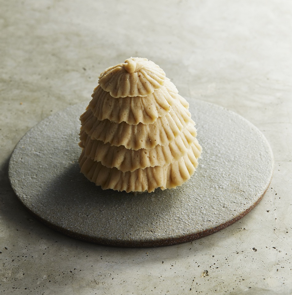 Beneath the mousse layer is a Jamfiture de Noël and almond nougat, made with plenty of fruits, nuts, and spices, with a base of almond and chocolate meringue.