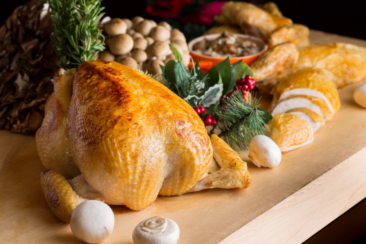Roasted chicken that is juicy and offers the right amount of crunch and flavor is stuffed with chestnut and mushroom butter rice.