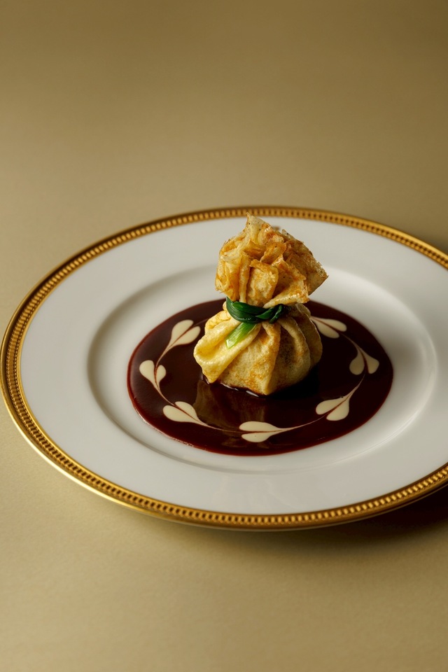 Sea eel, scallop mousse and mushroom wrapped in crepe, Port wine sauce